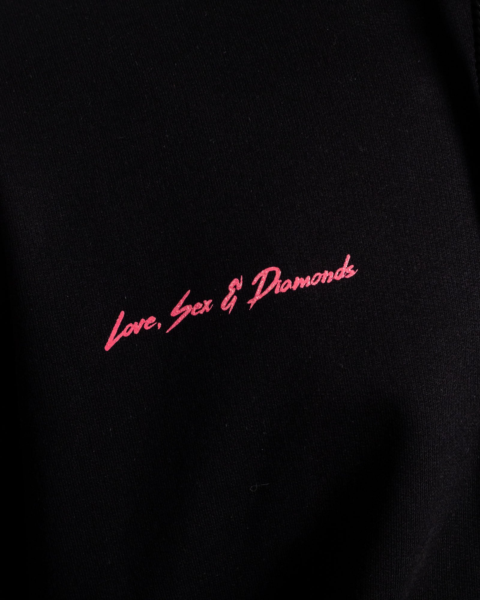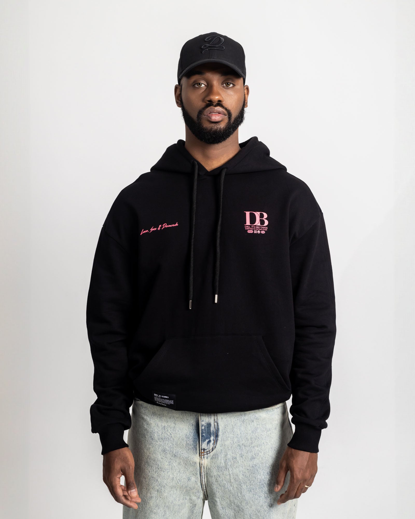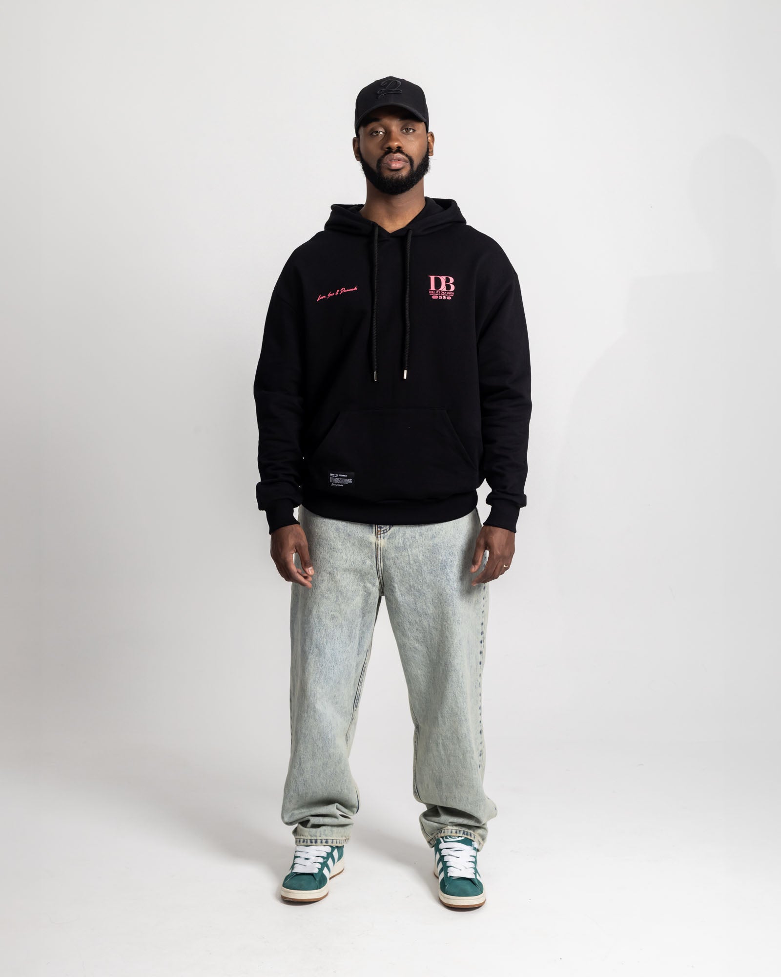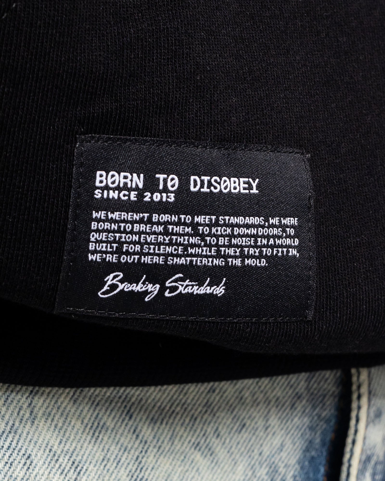 Hoodie oversize en negro. Diseño gráfico protagonista en la espalda con mensaje urbano y tipografías contundentes, combinado con detalles frontales sutiles que elevan el look. Silueta amplia, cómoda y pesada, pensada para dominar la calle de día o de noche.