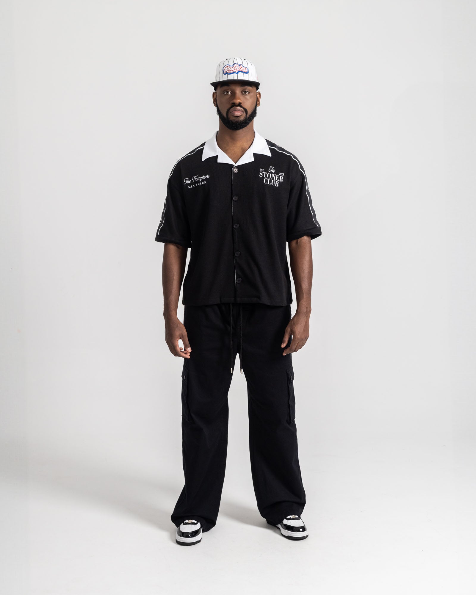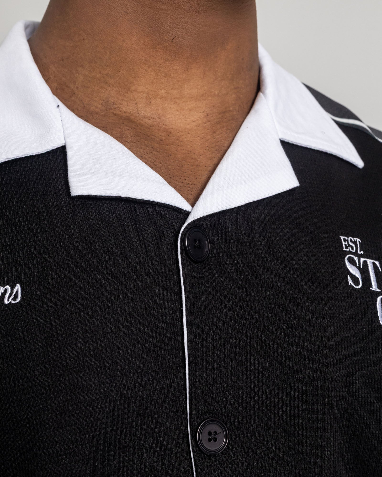 Camisa boxy de inspiración street–club, confeccionada en base textil tipo piqué suave y estructurado. Su silueta amplia aporta comodidad y flow urbano, mientras los botones frontales, cuello clásico en contraste y gráficos bordados elevan la prenda con un look premium y atemporal.