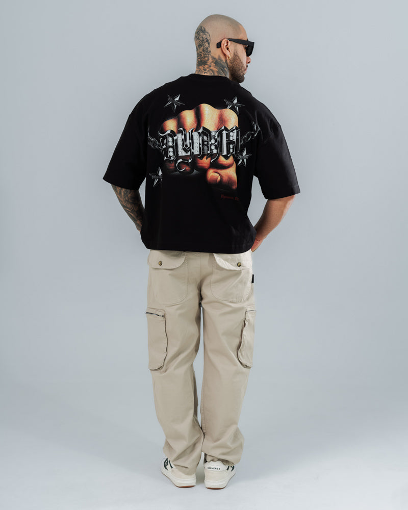 Camiseta Boxy Fit Dynamo Eternal Sacrifice, confeccionada en 100% algodón peruano de alta calidad (190-220 g), con silueta amplia que eleva tu estilo urbano. Diseño con gráfico frontal tipográfico y espalda con arte impactante, creada para quienes entienden que el sacrificio y la fuerza forman parte del juego.