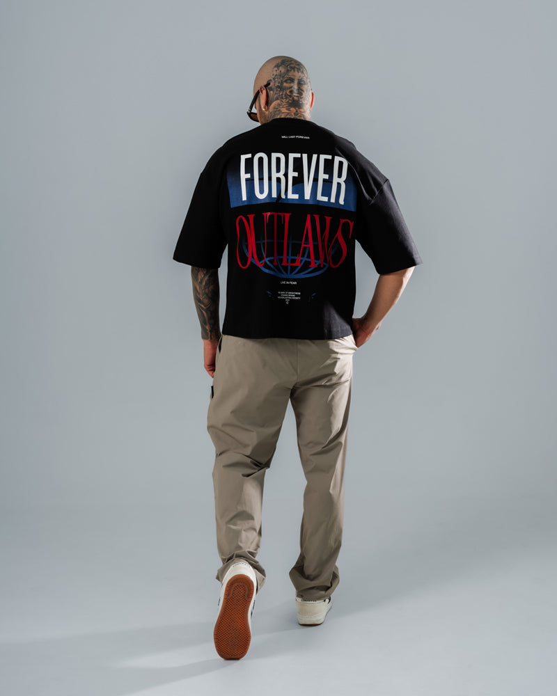La Camiseta Boxy Dynamo Forever Outlaws redefine la calle: silueta oversize, 100% algodón peruano de alto gramaje (190-220 g) y estampados frontales y traseros con actitud rebelde. Diseñada para quienes no siguen reglas, sino que las rompen.