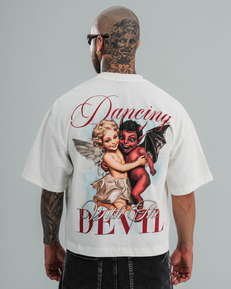 Camiseta Boxy Dancing With The Devil fusiona el arte clásico con la rebeldía del streetwear contemporáneo. Confeccionada en 100% algodón peruano (190–220 g), su caída estructurada y gráfica provocadora representan la dualidad del bien y el mal, esencia pura del ADN Dynamo.