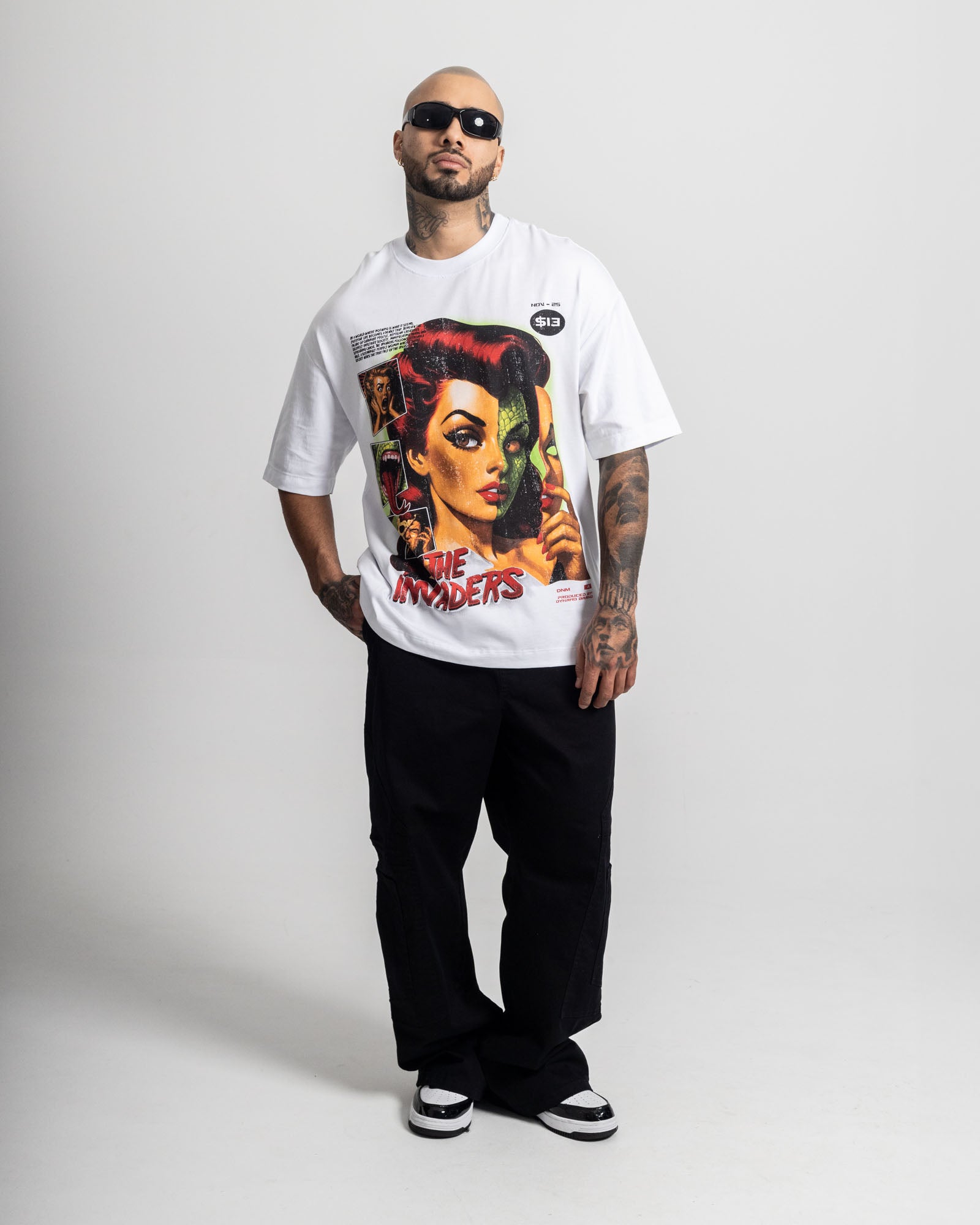 Camiseta Oversize Dynamo elaborada en algodón premium, con fit amplio y caída relajada. Cuenta con un estampado gráfico frontal de alto impacto, inspirado en la cultura pop y el streetwear, con acabado tipo vintage. En la parte trasera incorpora letras en piedrería, que aportan brillo sutil y un contraste potente con el diseño. Cuello reforzado, costuras resistentes y una silueta pensada para destacar.