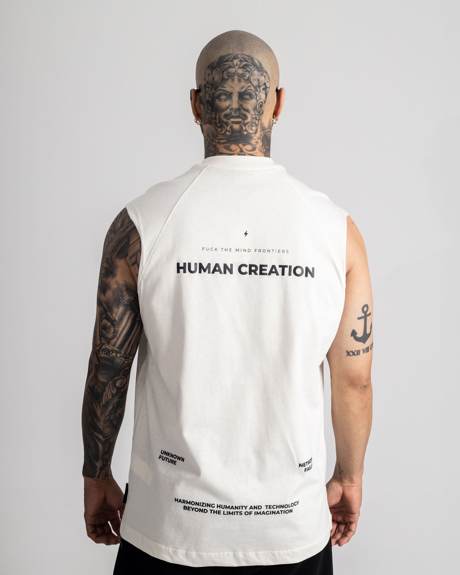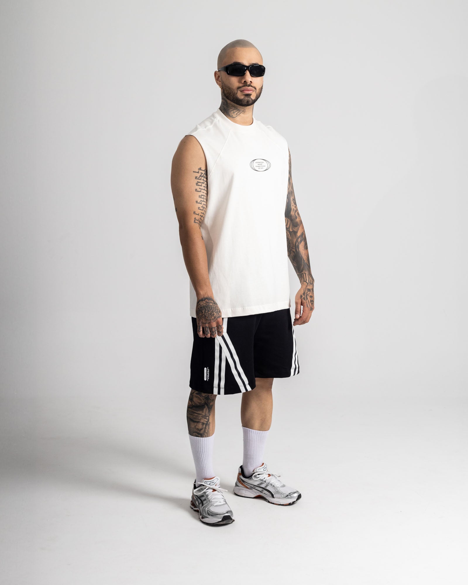 Camiseta sin mangas regular en algodón de alta calidad, diseñada para máxima comodidad y libertad de movimiento. Cuenta con costuras limpias, cuello reforzado y acabado premium que mantiene la estructura de la prenda. Gráficos tipográficos minimalistas al frente y espalda que consideren una vibra urbana y conceptual.