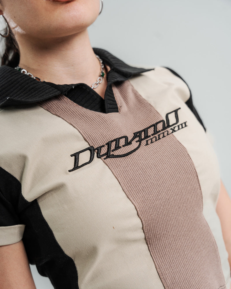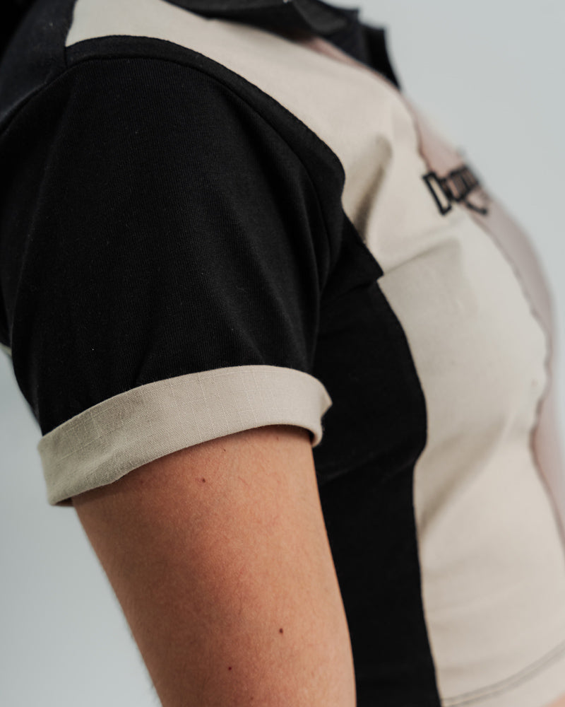 Crop Top para dama confeccionado en 100% algodón peruano (190-220g), suave, resistente y pensado para usarse todos los días. Silueta corta y estructurada, bloques de color que estilizan la figura y cuello tipo polo para un giro más street femenino con actitud. Un básico con carácter propio, diseñado para verse seguro, rápido y con estilo.