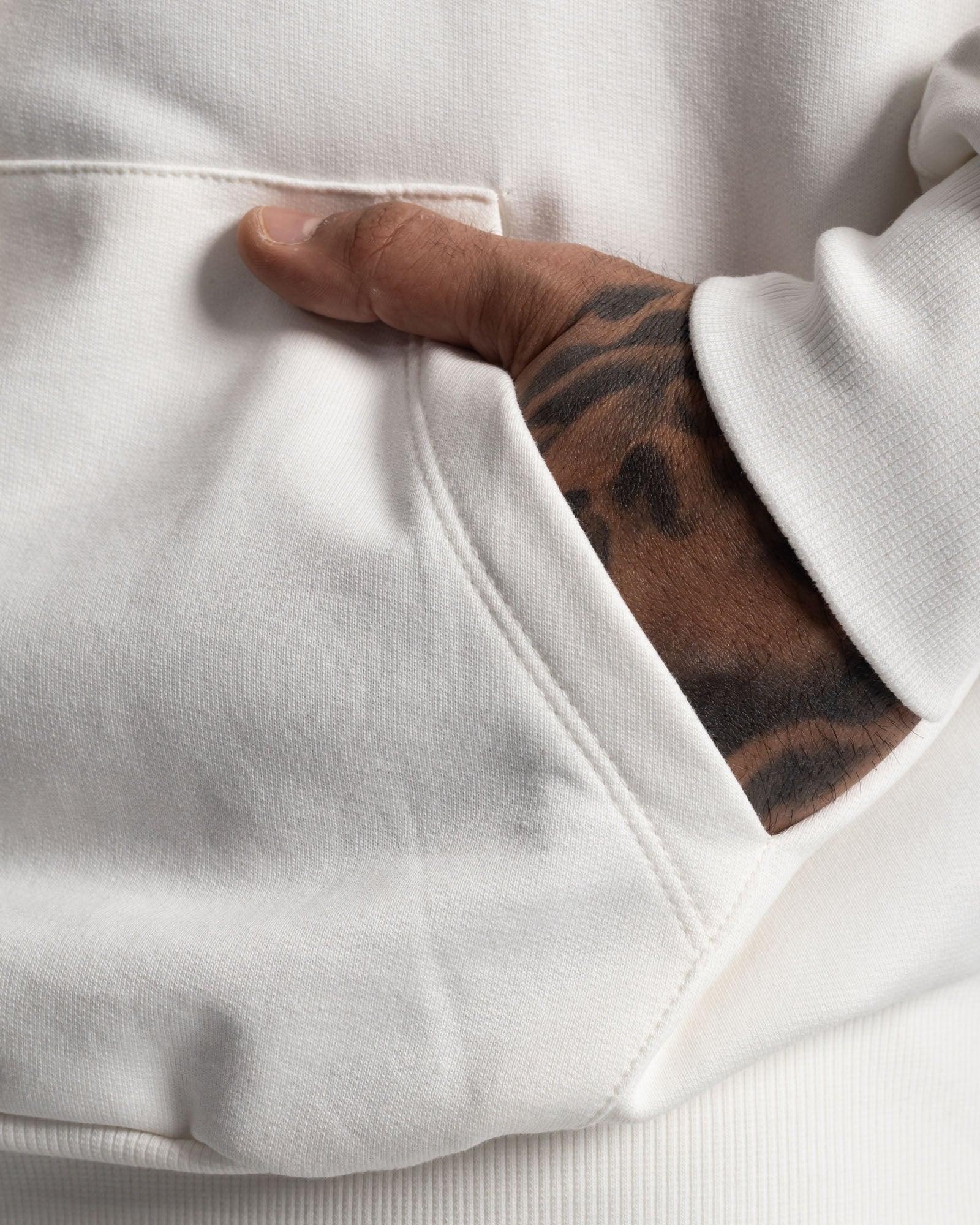 Hoodie oversize. Confeccionado en algodón de alto gramaje, ofrece una caída pesada y un fit amplio que eleva el streetwear a una pieza de statement. Capucha estructurada, bolsillo canguro y gráficos icónicos en la espalda que representan el balance entre fuerza, identidad y estilo urbano.