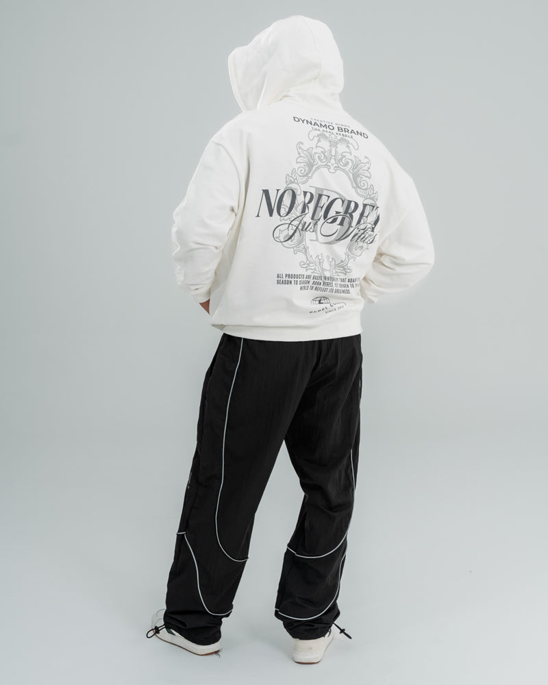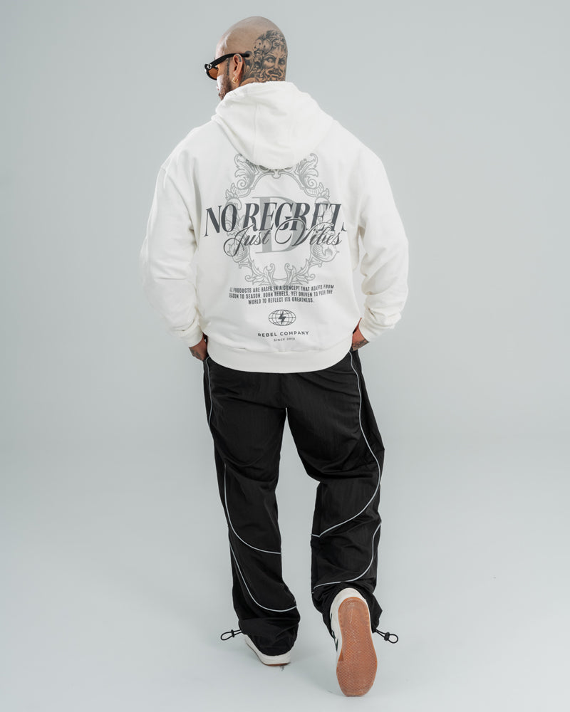Hoodie oversize No Regret. Silueta urbana, premium y cómoda. Confeccionado en 100% algodón de alto gramaje, ideal para mantenerte cálido y con estilo. Gráfico imponente en espalda y detalle frontal en estilo ornamental que afirma tu camino: sin arrepentimientos, solo actitud.Perfecto para quienes no piden permiso y van por lo que quieren.