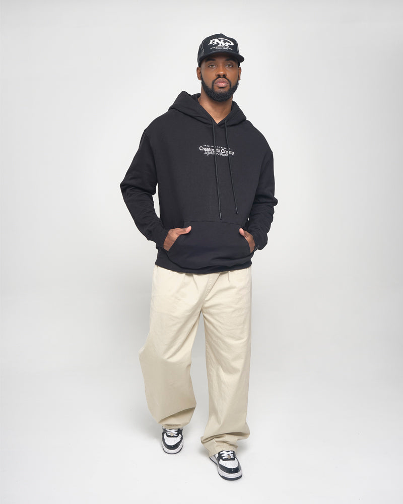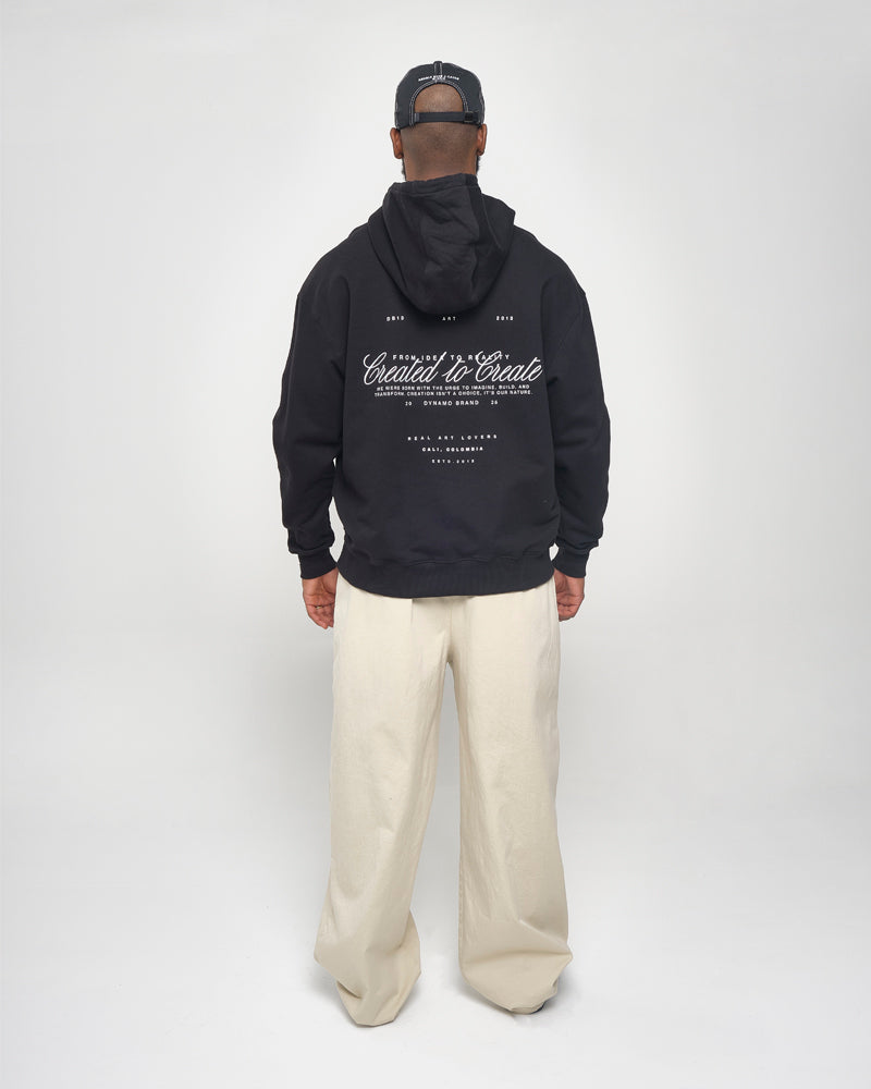 Hoodie Oversize, combina actitud y creatividad en una silueta amplia que impone presencia. Minimal al frente, manifiesto en la espalda: Created to Create.