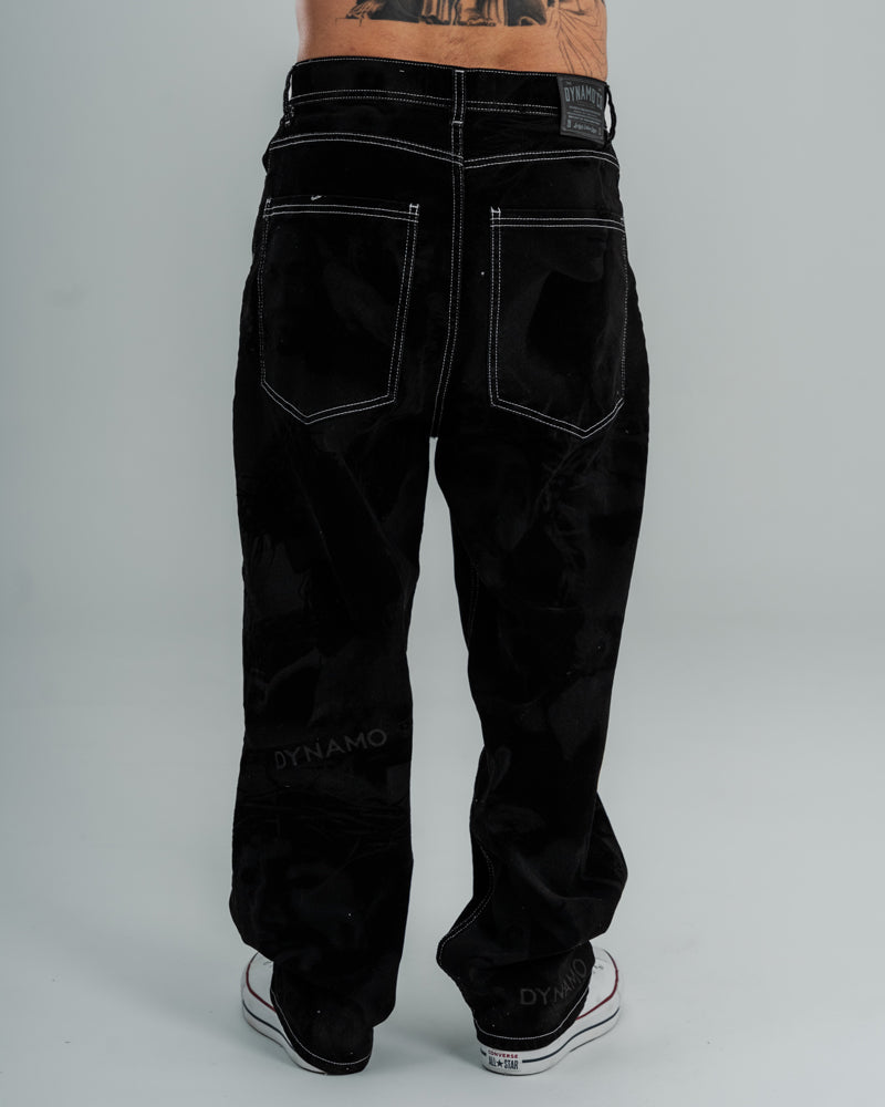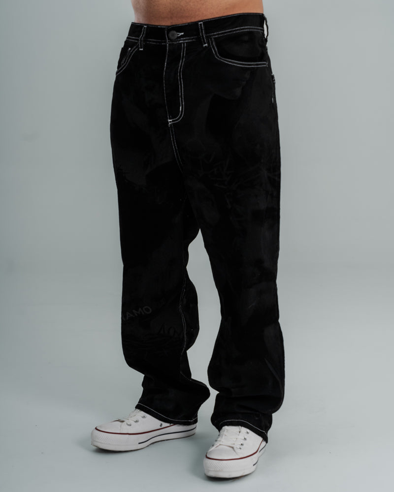 Jeans Baggy Dark Faith redefine el estilo urbano con textura rígida y contrastes marcados. Su base en denim estructurado y costuras visibles resalta el arte grabado en el tejido, un statement de rebeldía y diseño exclusivo bajo el ADN de Dynamo.