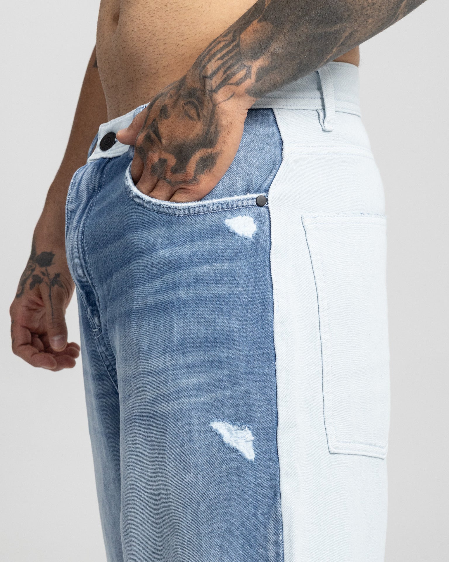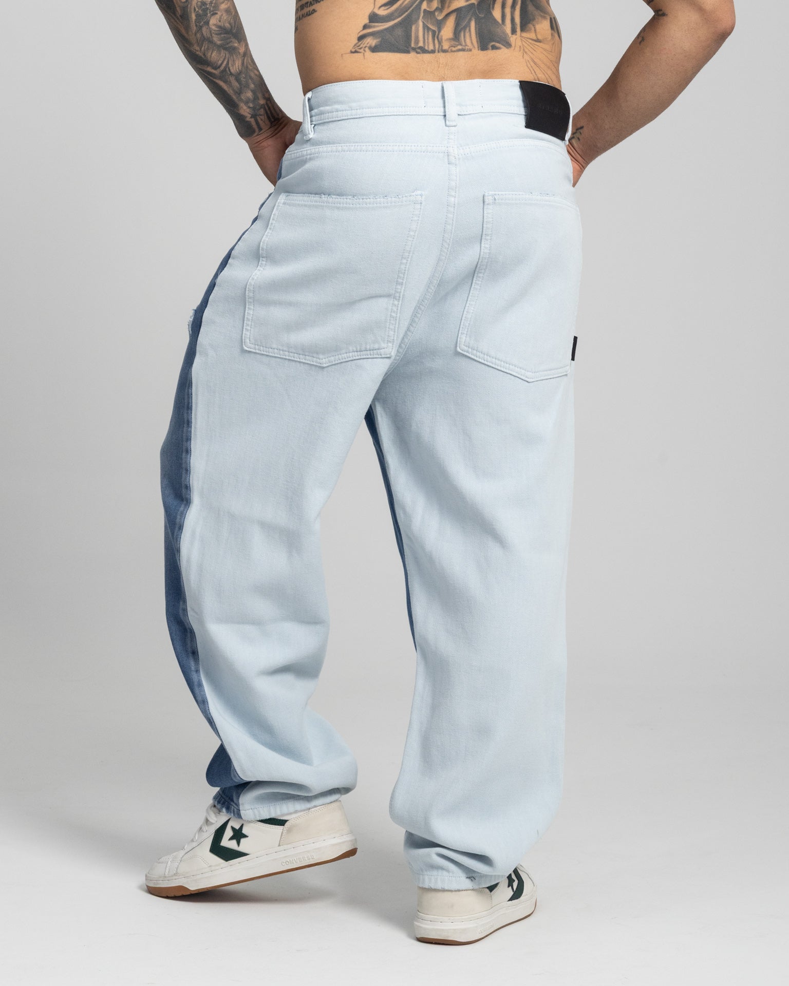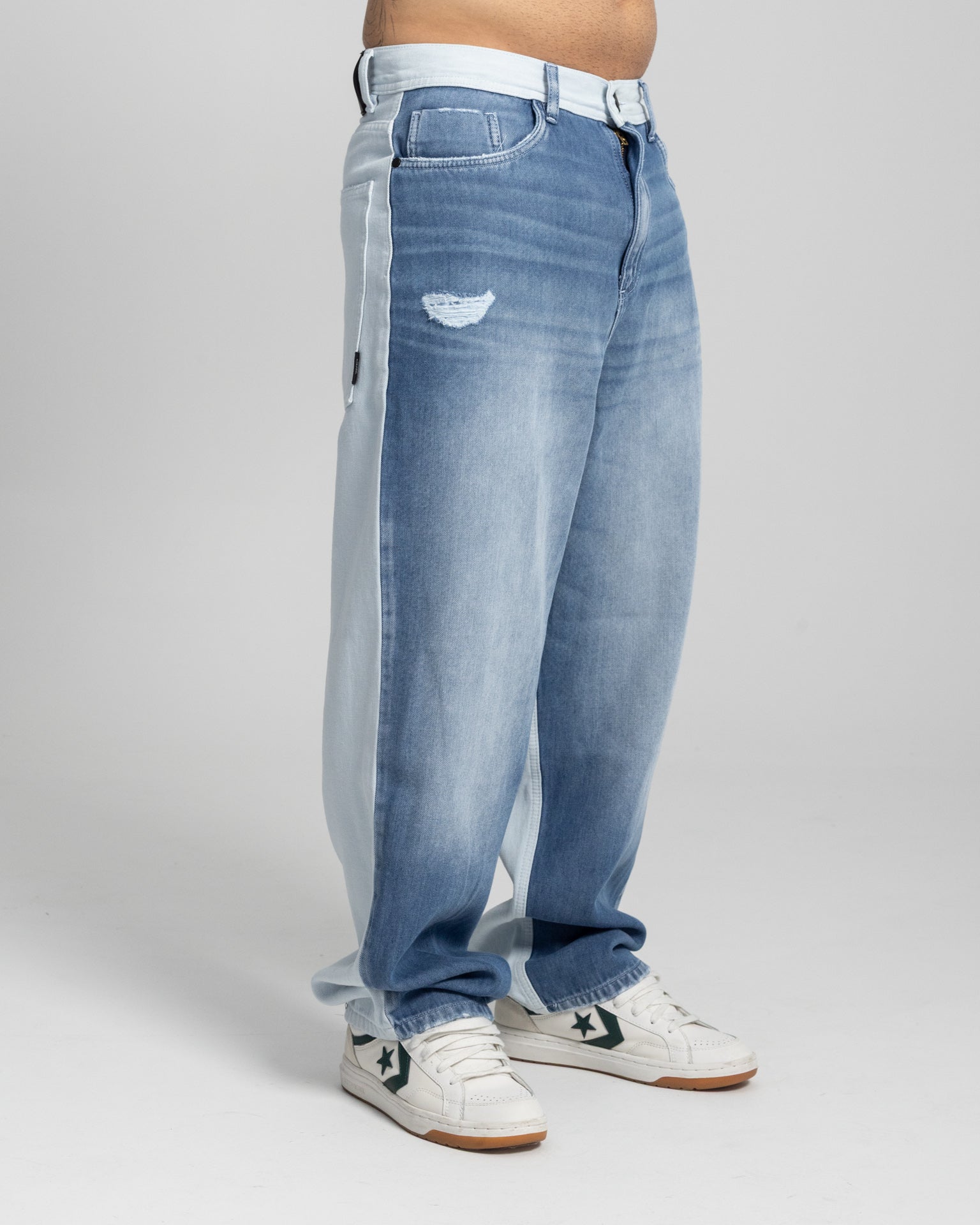 Hecho en denim rígido, resistente y con un desgaste frontal que le da carácter. El contraste lateral en tono claro le da ese look único que se ve en calle y en foto.Tiene bolsillos amplios atrás, pretina clásica y caída suelta desde la cadera hasta el botín para que lo uses con tenis o botas y se vea fresco sí o sí.