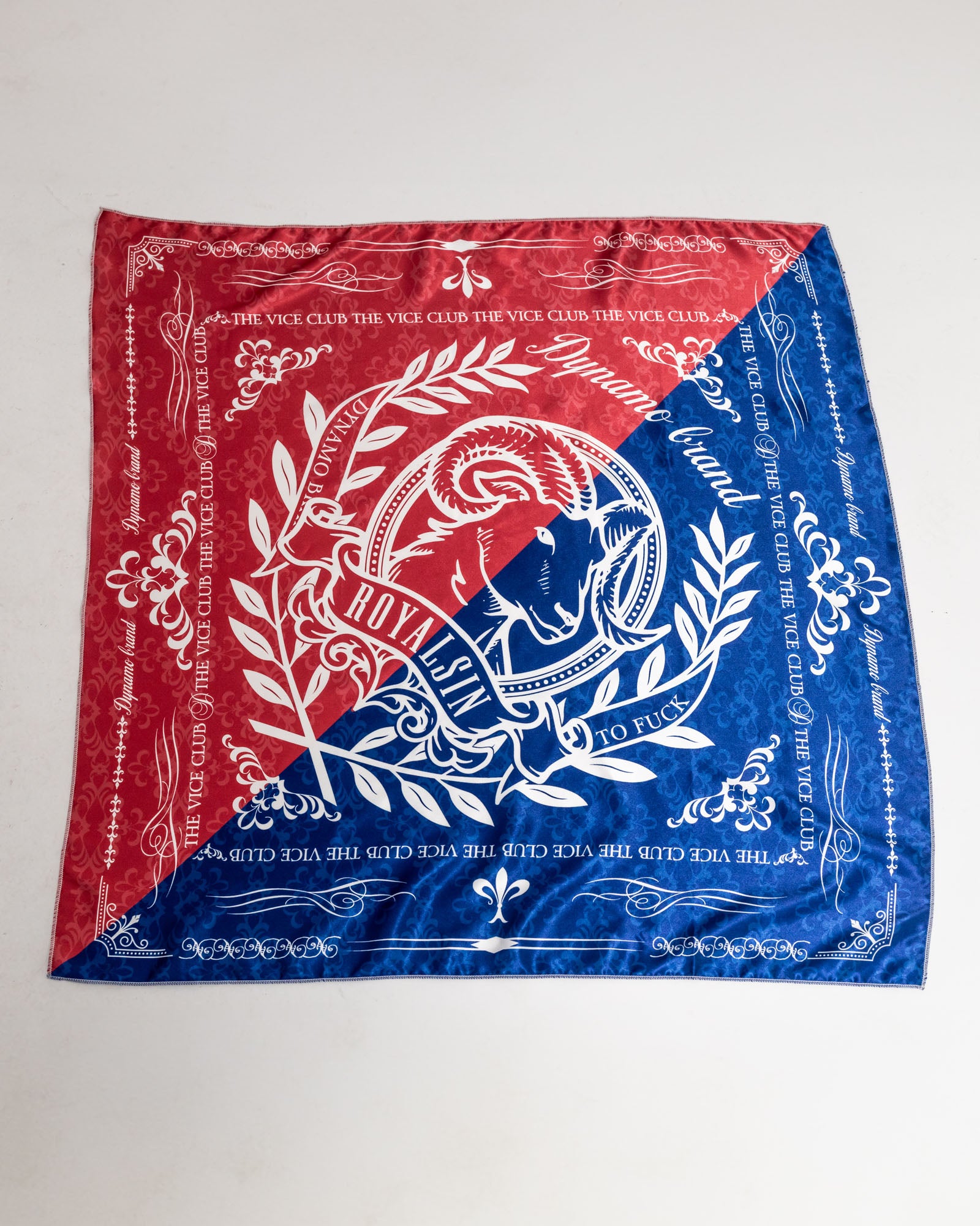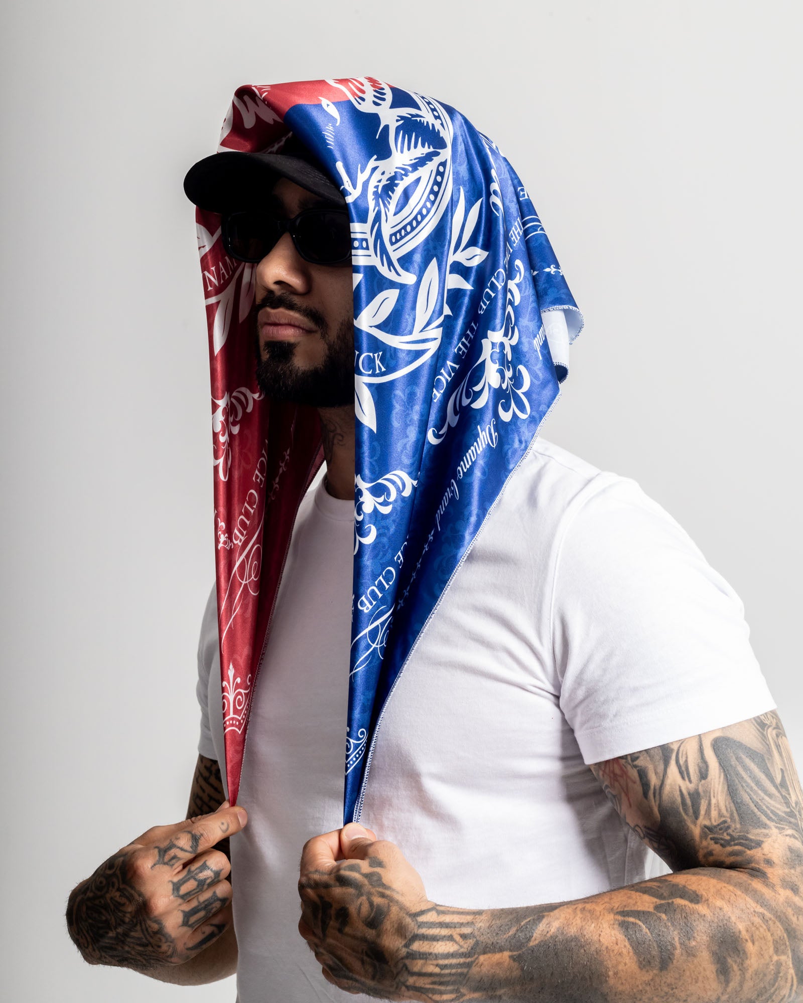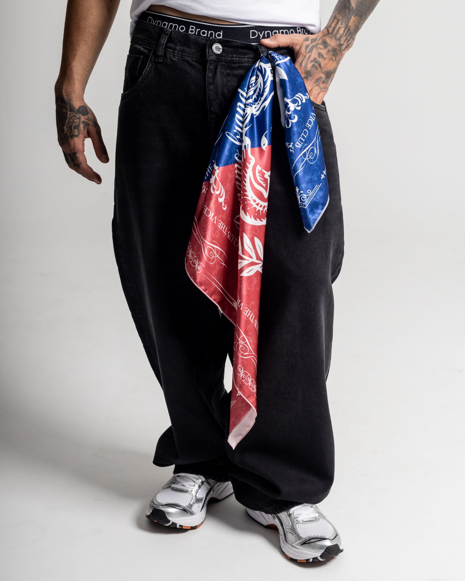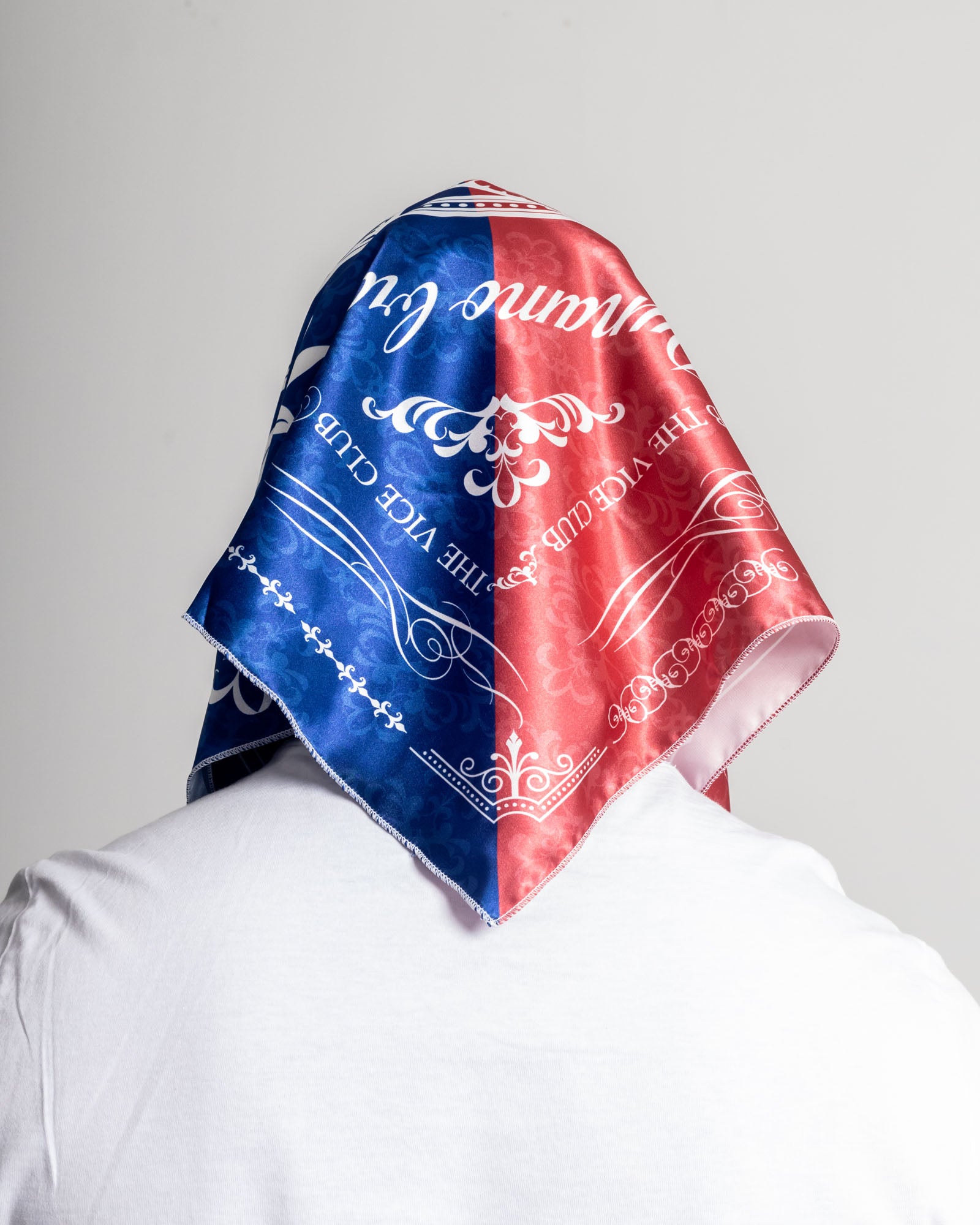 Pañoleta satinada bicolor rojo y azul, con estampado full-print inspirado en emblemas de poder y códigos callejeros. Su tacto suave y brillante eleva cualquier fit: úsala en la cintura, cuello o cabeza para rematar tu look. Un accesorio versátil, agresivo y con presencia.