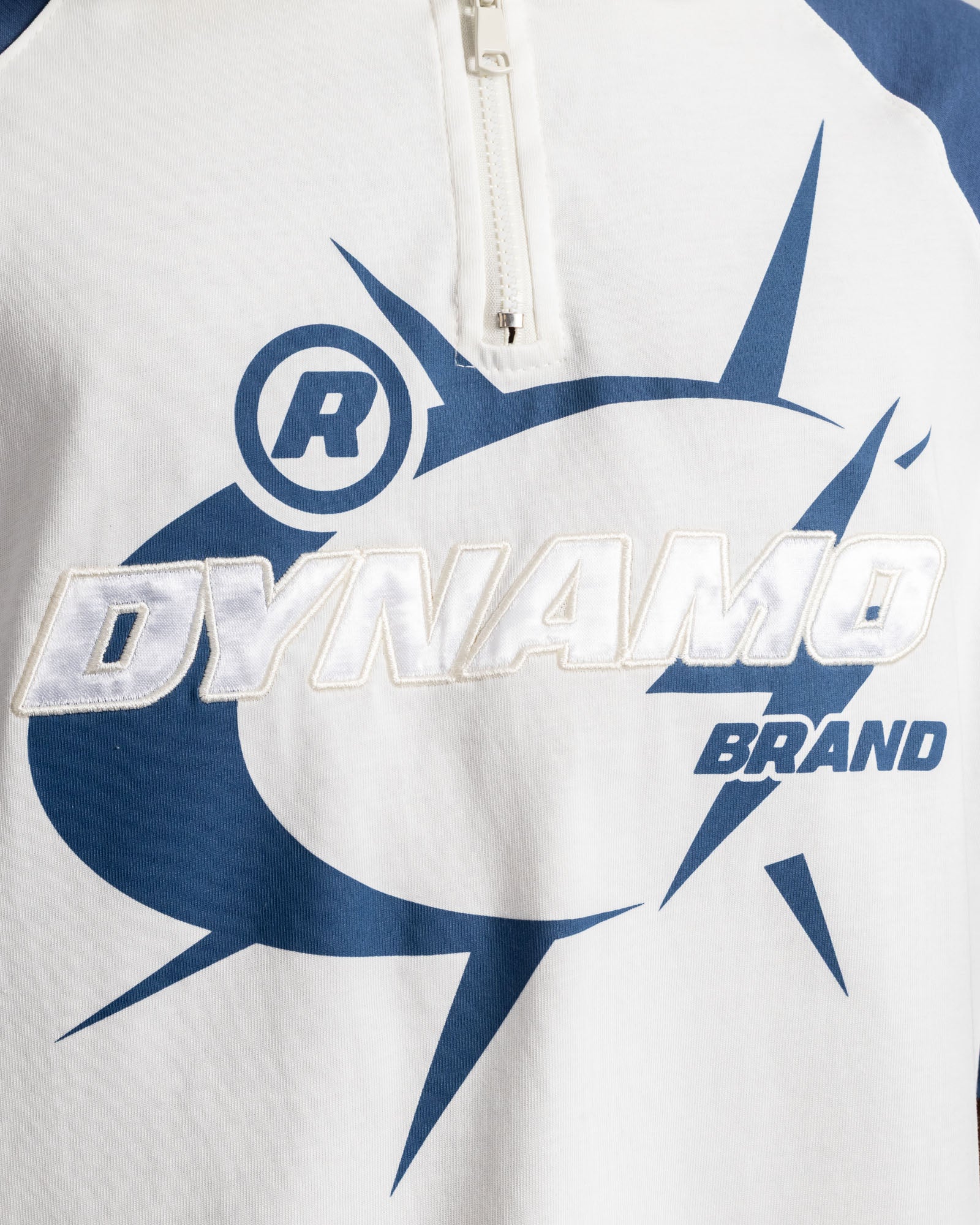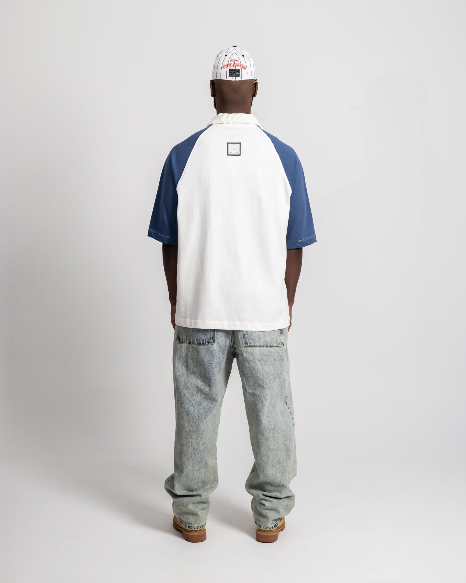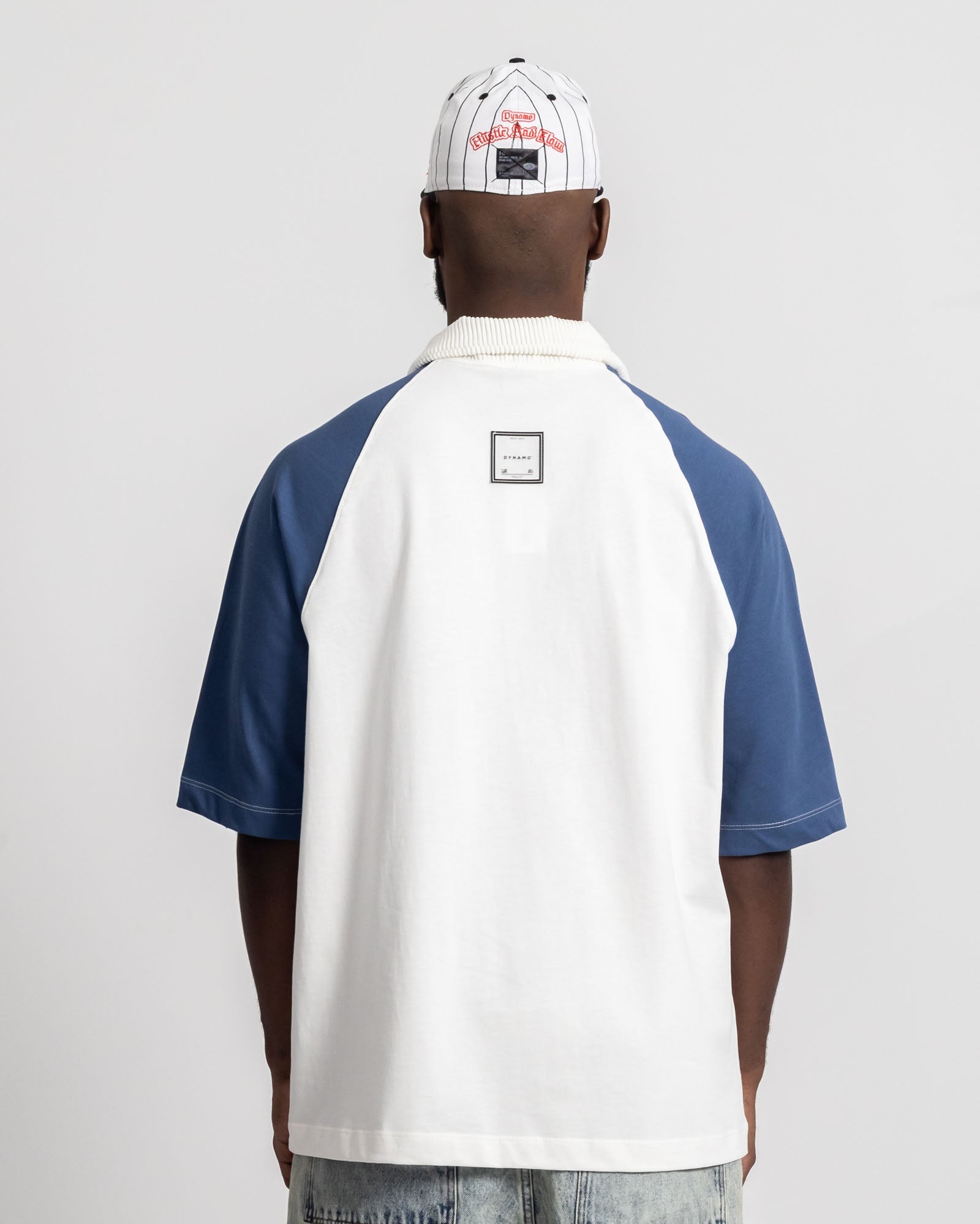 Polo Oversize Dynamo Brand con silueta amplia y estructura sólida. Diseño en contraste blanco con mangas azul tipo raglán, cuello alto con cierre frontal que marca diferencia y costuras visibles que refuerzan el carácter street. El gráfico frontal aporta identidad sin sobrecargar, mientras la caída pesada y el fit relajado aseguran presencia y comodidad todo el día.